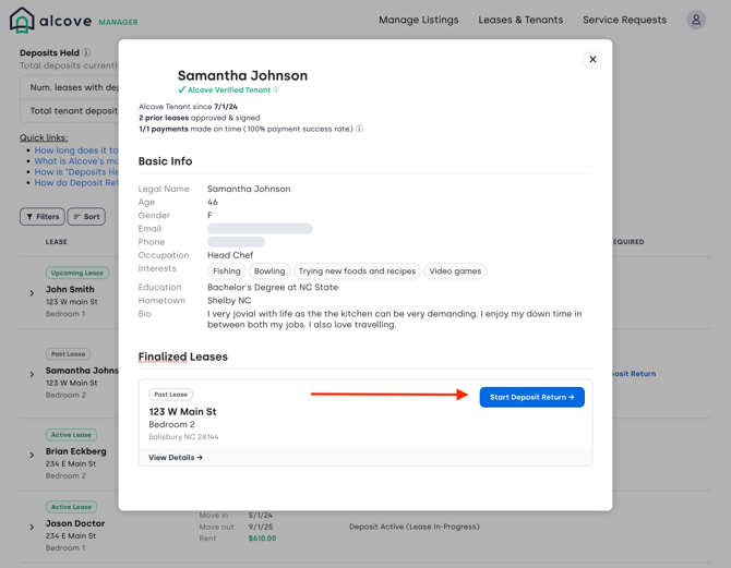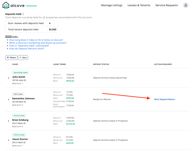At the end of your tenant's lease, Alcove will send you an email notification informing you that the deposit return process is now open. You will have a 30-day window following the end of the lease to finalize the deposit return.