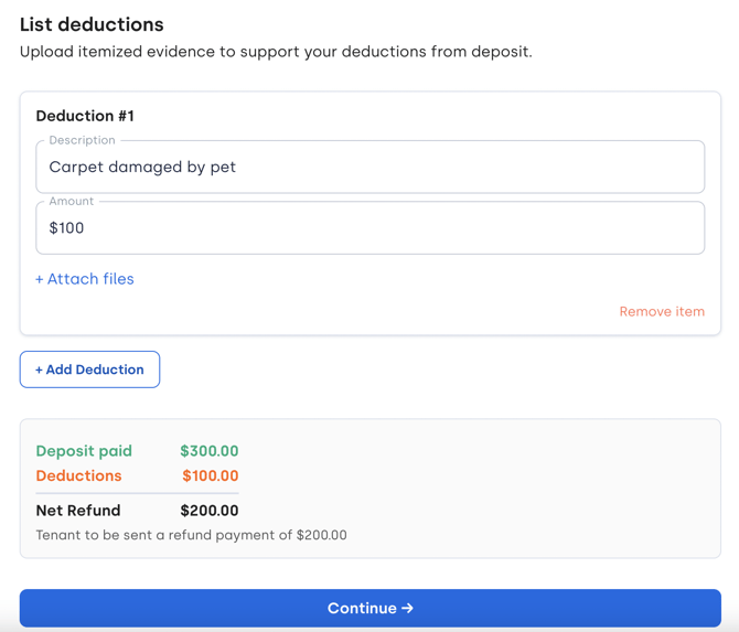 If the charges to tenants are less than the deposit amount: Alcove will initiate the process of refunding the tenant's deposit. The tenant will receive the selected Deposit refund amount refund via a bank/ACH transfer directly to their bank account. The refund process may take several business days to complete, depending on standard ACH processing and bank transfer times. The Deposit refund amount]will be deducted from your ledger and used to reimburse the tenant, reducing your next rent payment by the same amount.