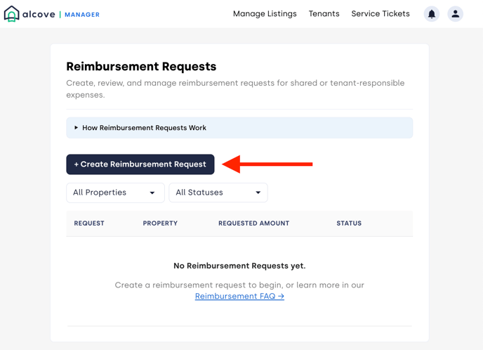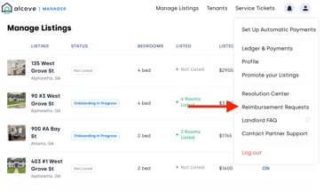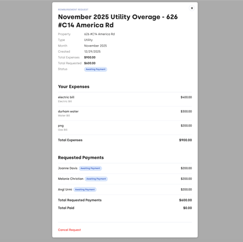 Once invoices are sent to tenants, Alcove will automatically send payment reminders on your behalf. The reimbursement request status will update to Awaiting Payment, and you can track the progress of each tenant’s payment at any time from your Reimbursement Requests page.