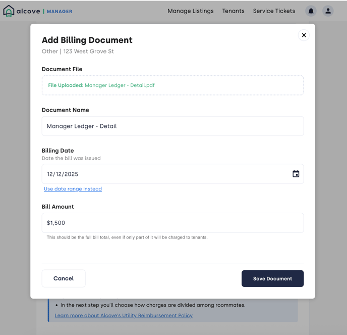 In these cases, the billing period on the uploaded bill must overlap with the utility overage month you are requesting reimbursement for. When submitting reimbursement requests, please ensure you are consistent in how bills are applied so that tenants are not charged twice for the same billing period.
