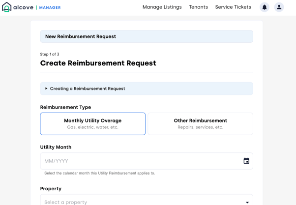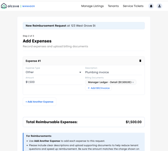 Alcove’s Reimbursement Request Portal allows you to request payment from tenants for eligible, tenant responsible expenses, such as utility overages or damages. Fully integrated with the Alcove Manager Portal, Ledger, and Ticket System, it enables you to: