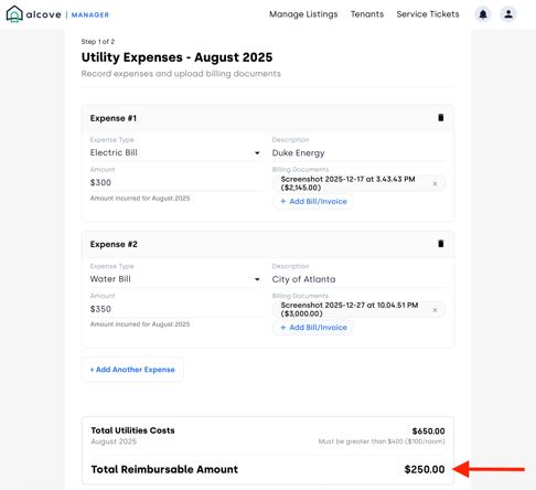As you enter each expense and amount, the page will automatically calculate the total cost and the reimbursable amount. The reimbursable amount is calculated based on the number of bedrooms in your property and the utility overage policy.