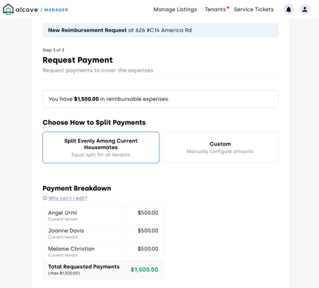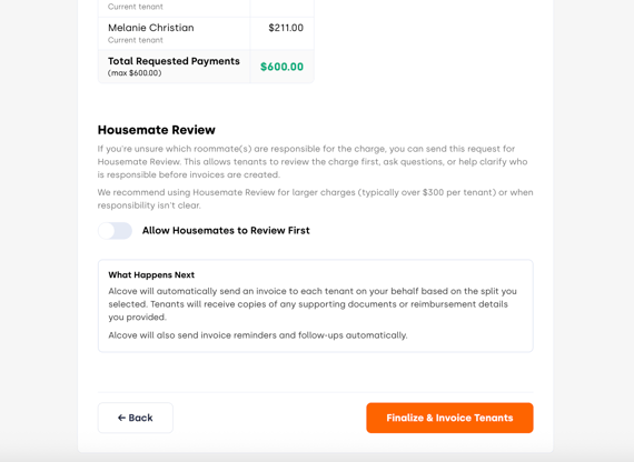 Alcove will automatically generate and send an invoice to each tenant based on the split you selected. Tenants will receive any supporting documents or reimbursement details you uploaded with the request. They can still submit a feedback request ticket until the invoice is paid.
