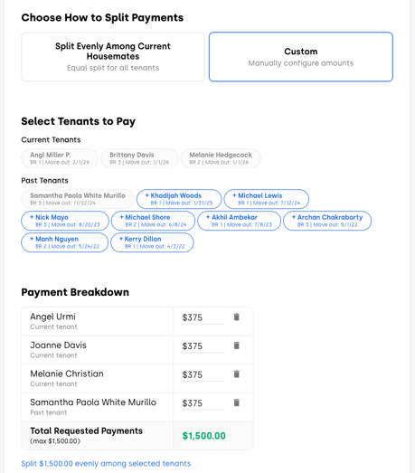 You may choose a custom split if you have a specific reason to do so - for example, if one tenant should pay a different amount or if you need to include past tenants.