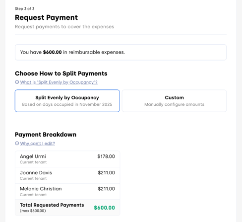 Request Payment Page: Split Evenly by Occupancy